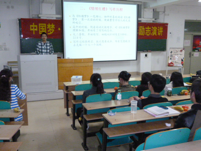 首先,《情续红楼》作者何恩情同学发表演讲。讲述自己创作的艰辛历程,从初中开始研读《红楼梦》,高中萌发续写念头,到大一开始写作,历经3年多完成这本30万字的《情续红楼》。何恩情同学主要为我们讲述他所创作的书中的结构框架以及书中各个人物的梦想,“梅花香自苦寒来”,只有经过艰苦的磨砺,才能散发出迷人的芳香, “付出才会有回报”,这也是何恩情同学传达给我们的人生信条。最后播放了一段媒体对何恩情同学义卖《情续红楼》帮助大学生的视频,让我们更加深刻的认识了这个“十佳大学生”何恩情。