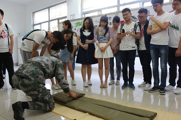 观毕,同学们在学员的带来下,参观了宿舍内务,深入了解了军校学员的日常起居,整洁干净的宿舍、整齐划一的物品摆放、方方正正的被子,令参观的每一个同学感到赞叹。随后,学员为大家进行了叠被子和打背包演示,同学们亲眼见证了一条被子在学员们迅速有力的动作下,变得如同豆腐块般方正。同学们从中感受到军校严谨的生活作风,了解到纪律对于军队的重要性,也意识到纪律的养成是要从每一个细节开始做起,并持之以恒。