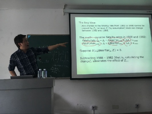 Carl Lin教授首先介绍了美国大学与中国大学在教育体制上的异同以及中美大学的合作与交流趋势。随后,Carl Lin教授通过将理论和实践相结合,对微观经济计量学进行了生动讲解。林教授广泛介绍了微观经济计量学中代表性模型的理论基础,着重强调微观经济计量方法的实证应用,突出对建立及运用模型过程中各种实际问题的处理,重点讲解了工具变量在面板数据回归中的运用以及双重差分(DID)、倾向得分匹配(PSM)和断点设计(RD)等识别变量因果关系的方法。
