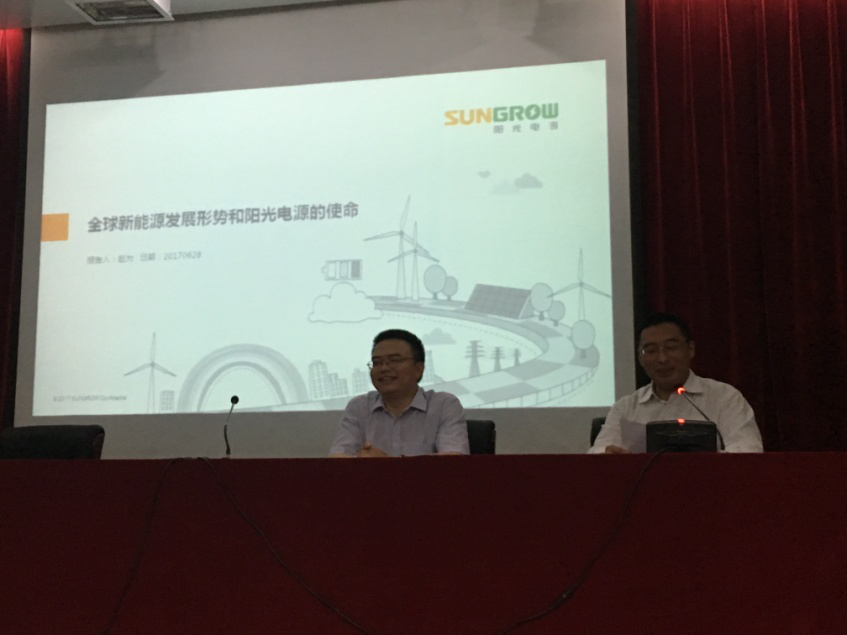 赵为博士首先利用图表和数据,结合国家电力体制等因素,介绍了风能、太阳能和核能等全球新能源发展的最新趋势。随后赵为博士又基于丰富的视频资料,讲述了阳光电源的发展概况和企业使命,并着重强调了阳光电源诚恳务实、重视研发和精益求精的进取精神以及“致力于清洁高效,让更多人享受绿色电力”的企业使命。最后在讲座的互动环节,赵为博士与师生就“贸易保护”、“光伏成本”、“国内外市场选择”、“一带一路”等相关国际经贸议题展开了深入讨论。讲座在师生们热烈的掌声中圆满结束。