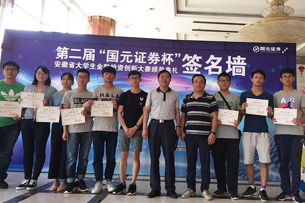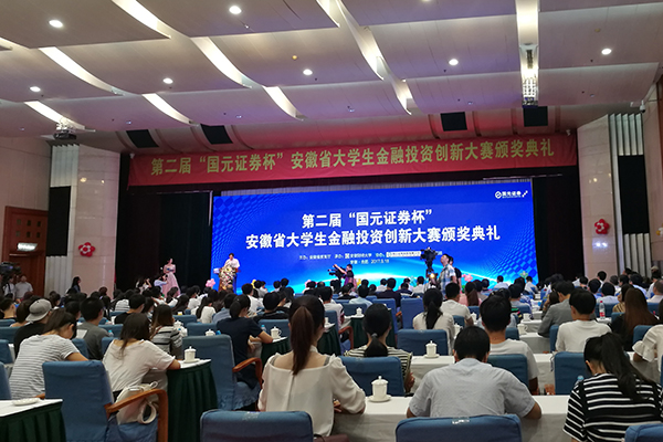 9月18日下午,第二届“国元证券杯”安徽省大学生金融投资创新大赛颁奖典礼在合肥稻香楼宾馆成功举行。安徽省政府副省长谢广祥,省政府副秘书长吴行,省金融办党组书记、主任何昌顺,省证监局党委委员、纪委书记李兵,以及省内金融系统其他领导与会并为师生颁奖。省教育厅厅长李和平,国元证券党委书记、董事长蔡咏,安徽财经大学党委副书记、校长丁忠明参加了本届颁奖典礼,为获奖人员颁奖并致辞。