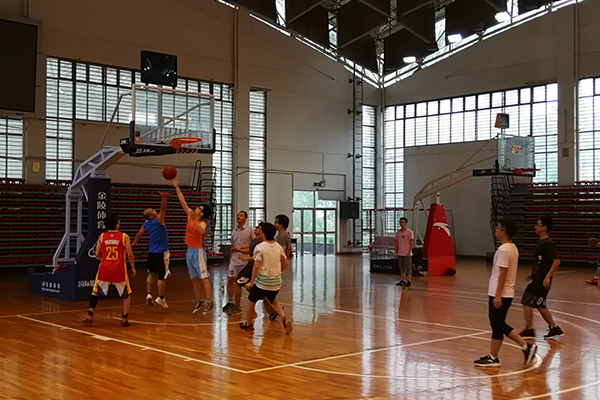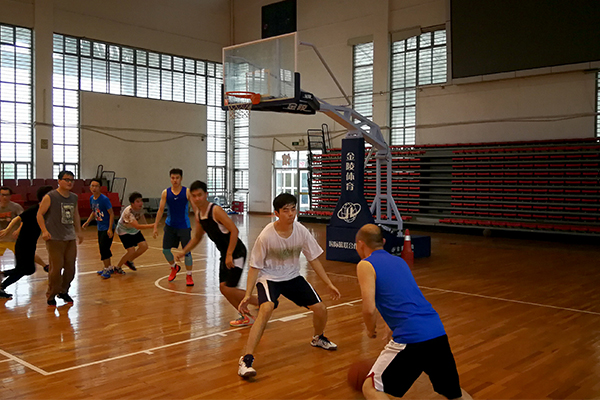 即使是雨天也并没有削弱同学们踊跃参与的激情。活动还没开始,就已经有很多同学提前到场地热身。等参赛人员都到齐后,活动正式开始。全部活动由四个部分组成,分别为夹球接力赛,天旋神射手,师生三分球赛,师生篮球比赛。