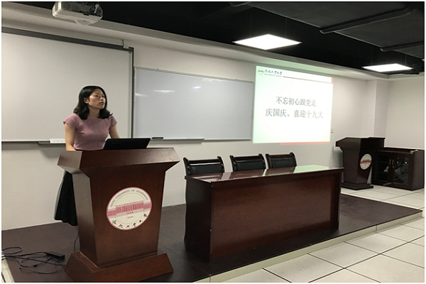 党支部书记杨蓉同学首先介绍了中国共产党第十九次全国代表大会的基本状况。党的十九大,是在全面建成小康社会决胜阶段、中国特色社会主义发展关键时期召开的一次十分重要的大会,承担着谋划全面建成小康社会,深入推进社会主义现代化建设的重大任务,事关党和国家事业的继往开来,事关中国特色社会主义的前途命运,事关广大人民的根本利益。
