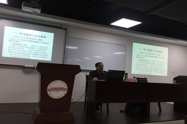 12月7日晚,yL23411永利官网登录“讲述中国故事”教授讲坛第五讲在翡翠湖校区科教楼B座1101开讲,钟玉海教授担任主讲,报告题目为:“学党章 忆党史 强党建——学习党的十九大党的理论”。报告会由学院副院长张先锋主持,学院党委副书记胡晓浩、本科生党员、发展对象班学员聆听了报告。