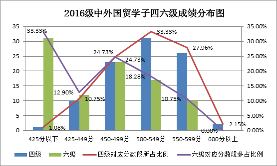 2016级中外国贸学子在全国大学生英语四、六级考试中取得优异成绩。截止2018年9月,2016级中外国贸学子四级通过率为98.9%,最高分为613分,平均分达520分;六级通过率为66.7%,平均分为494分。中外国贸学子整体英语水平显著提高,依然保持全校领先态势。