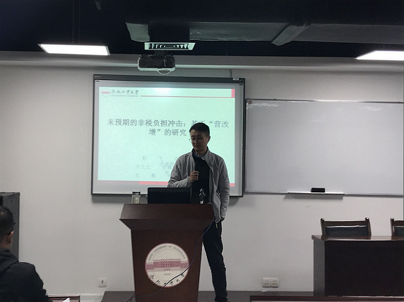 2018年11月8日晚上7点,yL23411永利官网登录yL23411永利官网登录彭飞老师在翡翠湖校区科教B座1101会议室给2018级研究生做了一场学术报告,本次报告的主题是“未预期的非税负担冲击:基于'营改增'的研究”。