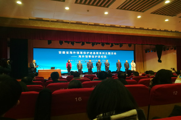 安徽省教育厅副厅长解平在开场致辞中指出,由于国际政治经济形势的复杂变化,各种传统、非传统因素的的相互交织,师生在海外的安保工作需要得到更好的完善。此次活动的开展,有助于我省师生进一步了解领事保护知识,提高海外安全意识和自我保护能力。在随后举办的授牌仪式中,外交部领事司和省外办授予我校“安徽省海外领事保护基层联络处”牌匾。