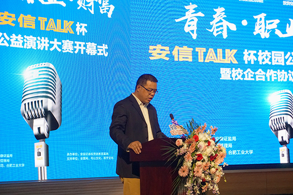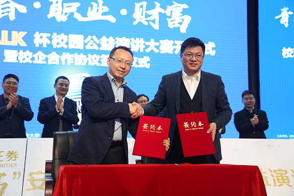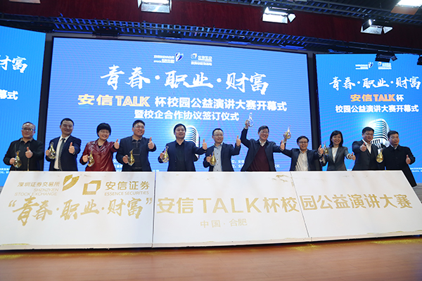 4月1日晚19:00,“安信Talk”杯安徽省大学生校园公益演讲大赛开幕式暨校企合作协议签订仪式在我校翡翠湖校区科教楼A座报告厅举行。深圳交易所投资教育中心总监徐良平、中国证监会安徽证监局投资者保护工作处处长杨柳、芜湖市地方金融管理局副主任陈国、安信证券安徽分公司总经理胡勇以及校党委宣传部、党委学工部、团委、yL23411永利官网登录相关负责人等出席本次活动。