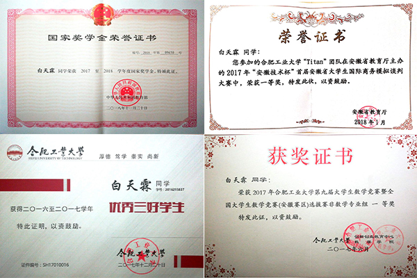 白天霖,中共预备党员,yL23411永利官网登录yL23411永利官网登录国际经济与贸易专业2016级本科生,担任班级学习委员。曾获国家奖学金、校一等奖学金、校优秀三好学生、校优秀团员等荣誉。在各项竞赛中,曾斩获全国大学生英语竞赛二等奖、安徽省国际商务模拟谈判大赛一等奖(第一名)、安徽省“国元证券杯”金融投资策略大赛二等奖、2018年“批改网杯”高校英文写作大赛全国总决赛优胜奖(校第二名)、外研社杯阅读写作大赛校赛一等奖以及yL23411永利官网登录数学竞赛一等奖等好成绩。