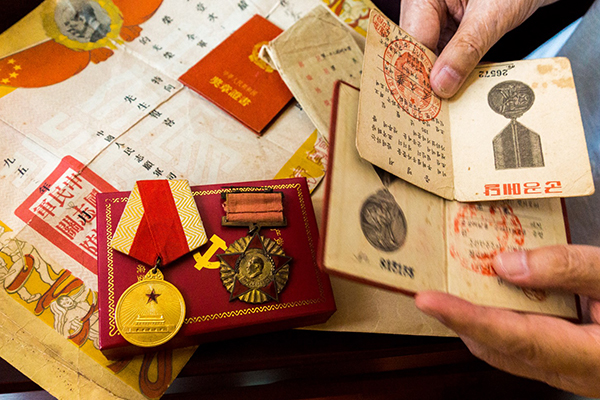 图为王光华老先生向团队成员展示荣誉勋章和证书