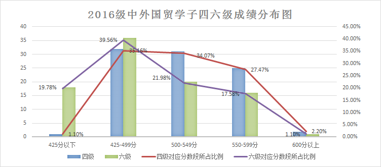 2016级中外国贸学子在全国大学生英语四、六级考试中取得优异成绩。截止2019年9月,2016级中外国贸学子四级通过率为98.9%,平均分达520分,最高分为613分;六级通过率为80.2%,平均分为505分(具体成绩分布如下图所示),最高分为639分,为当届(2018年12月)考试全校最高分,这也是继2015级中外国贸学子之后再次在六级考试中取得全校最高分。中外国贸学子整体英语水平显著提高,依然保持全校领先态势。