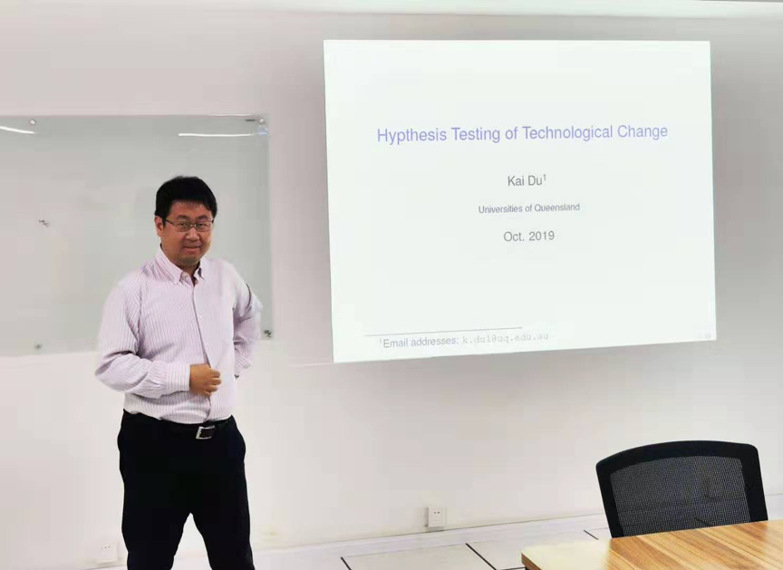 2019年10月28日,澳大利亚昆士兰大学杜凯博士应邀来访永利官网并做了题为“Bootstrap Hypothesis Testing of Technology Difference”的精彩报告。永利官网谭常春教授、陈亚副教授、中国科学技术大学管理学院张博副教授以及相关专业的硕士研究生参加了此次报告会。报告会由陈亚副教授主持。