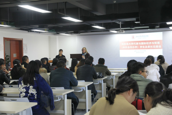 在随后举行的美国克拉克大学代表与国际经济与贸易(中外合作办学)专业学生及家长的见面会上,Amy Daly Gardner院长对克拉克大学的基本情况和合作办学项目作了详细介绍。在场学生和家长就中外合作办学项目的相关问题,如申请条件、项目优势、课程设置、英语学习、毕业生去向等方面积极提问,克拉克大学代表对此给予了全面详尽的解答。