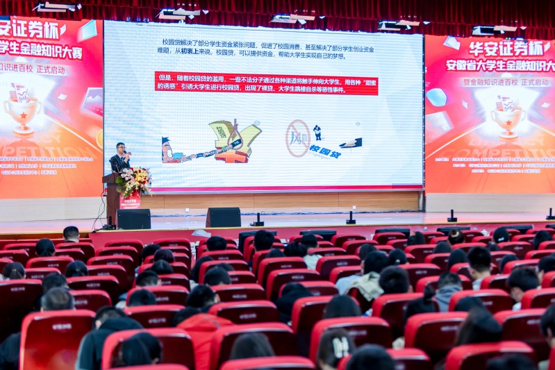 在答题互动环节,与会领导、嘉宾与同学们共同参与了金融知识大赛首场初赛。比赛以线上答题方式,面向全省高校开放答题通道,灵活的题库配置,紧张刺激的答题方式,题目答案的自定义设置,金融知识和技能的PK,让比赛兼具创意与智慧。期间,还随机抽取幸运同学赠送书籍《习近平与大学生朋友们》及投教礼品。活动最后,华安证券股份有限公司金融讲师赵蔷围绕校园金融风险的防范与解析作金融知识宣讲。