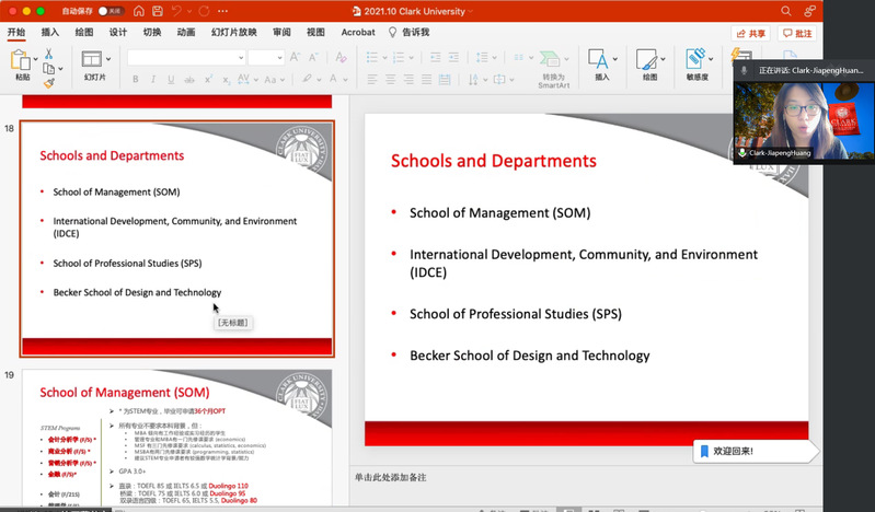 11月15日下午,克拉克大学研招办中国招生专员黄家芃应邀与永利官网教师进行线上座谈,并为永利官网学子举办克拉克大学硕士项目宣讲会。