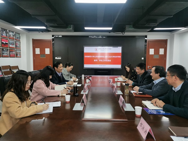 洪进院长对丁仁船院长一行到访表示热烈的欢迎,并简要介绍了学院办学历史、专业设置、学科建设及科研方面的进展。学院党委副书记、纪委书记谢晶晶介绍了我校劳动教育、美育教育的整体要求,以及学院开展相关工作的思路和做法,副院长庄德林介绍了学院创新创业、劳动教育等课程的开设情况。丁仁船院长对永利官网的热情接待表示了感谢,并就安徽建筑大学和公共管理学院的情况做了简要介绍。双方围绕学生劳动教育、美育教育、职业规划、就业指导、创新创业教育、科学研究等展开了深入的探讨和交流。