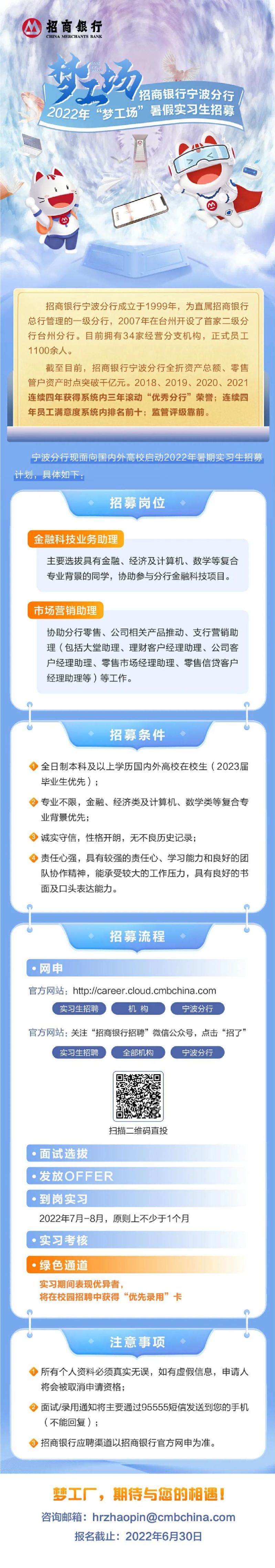 【实习信息】招商银行宁波分行2022年暑假实习生招聘