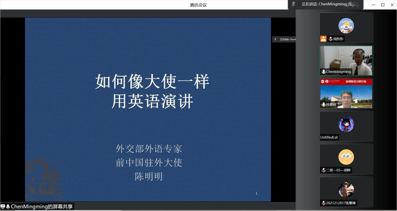 9月12日,永利官网与我校国际事务处共同主办的全球胜任力云讲堂系列讲座第八讲“如何像中国大使一样用英语演讲”成功举办。外交部外语专家、前中国驻外大使陈明明主讲。陈明明,中国资深翻译家、全国翻译资格考试专家委员会副主任、全国高级翻译职称评审委员会副主任,现任上海交大等多所院校客座教授,中国教育发展战略学会国际胜任力培养专业委员会专家、前中国翻译协会副会长,曾任外交部翻译室主任。永利官网副院长庄德林、国际教育中心全体人员、国际经济与贸易系部分老师及一百多名在校生参加了此次会议。