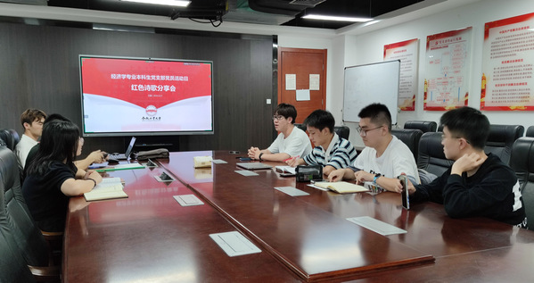 为深入推进党史学习教育,引导党员同志传承红色基因、弘扬革命精神,8月31日下午,经济学专业本科生党支部在翡翠科教楼B座1208室开展了以“赓续红色学脉 汲取奋进力量”为主题的红色诗歌分享会,会议由支部书记严瑾主持,其他支部成员参加了会议。