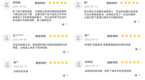 讲座期间,同学们认真聆听,踊跃提问,积极参与互动。讲座后,学生纷纷表示受益良多,并在第二课堂等平台留言发表自己的收获与感悟:“对国际公务员的要求和前景有了更加充分的了解,也意识到了在今后的工作中对高素质人才的需求越来越大,在以后的学习生活中会注重打开国际视野,跟上国际前沿。”此次系列讲座累计吸引全校师生1000+人次云端参与,活动推送累计阅读量达2000+人次,收获师生好评,取得了良好的效果。