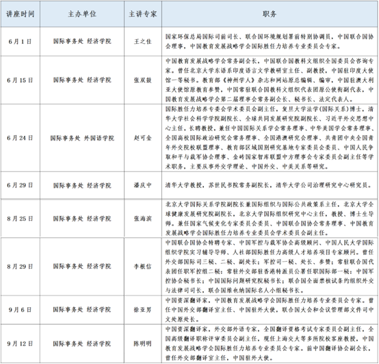 2022年6月至9月,【全球胜任力云讲堂】系列讲座共邀请了八位具有丰富国际组织和外事工作经验及深厚学术造诣的官员、大使、学者为广大师生带来精彩的讲座。他们分别是(按讲座时间先后顺序排列):