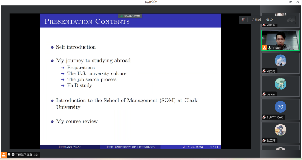 7月27日,永利官网卓越讲坛第八十一讲——“我的留学成长之路”成功举办。美国克拉克大学教师Ruixiang Wang主讲。永利官网二十余名学生及国际教育中心部分老师参加此次讲座。