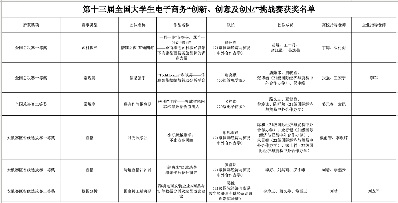 近日,第十三届全国大学生电子商务“创新、创意及创业”挑战赛(以下简称“三创赛”)常规赛全国总决赛在中国矿业大学圆满落幕。以永利官网学子储昭东为组长的“情满岳西 茶通四海”团队荣获乡村振兴实战赛“延安杯”全国总决赛一等奖,永利官网学子张博涵参与的“TechHorizen科视界——信息智能挖掘与辅助分析平台”在常规赛全国总决赛中荣获一等奖,永利官网学子陈昕然参与的“联舟作阵围鱼队”在常规赛全国总决赛中荣获二等奖。此外,以永利官网学子为组长的“时光欢乐社”团队和“跨境直播冲冲冲”团队分获跨境电商实战赛跨境直播比赛安徽赛区省级选拔赛一等奖和二等奖,“国宝特工精英”团队荣获跨境电商实战赛数据分析比赛安徽赛区省级选拔赛二等奖。永利官网指导老师丁涛、朱付彪、戴前智、李欣婷获“优秀指导老师”荣誉称号。
