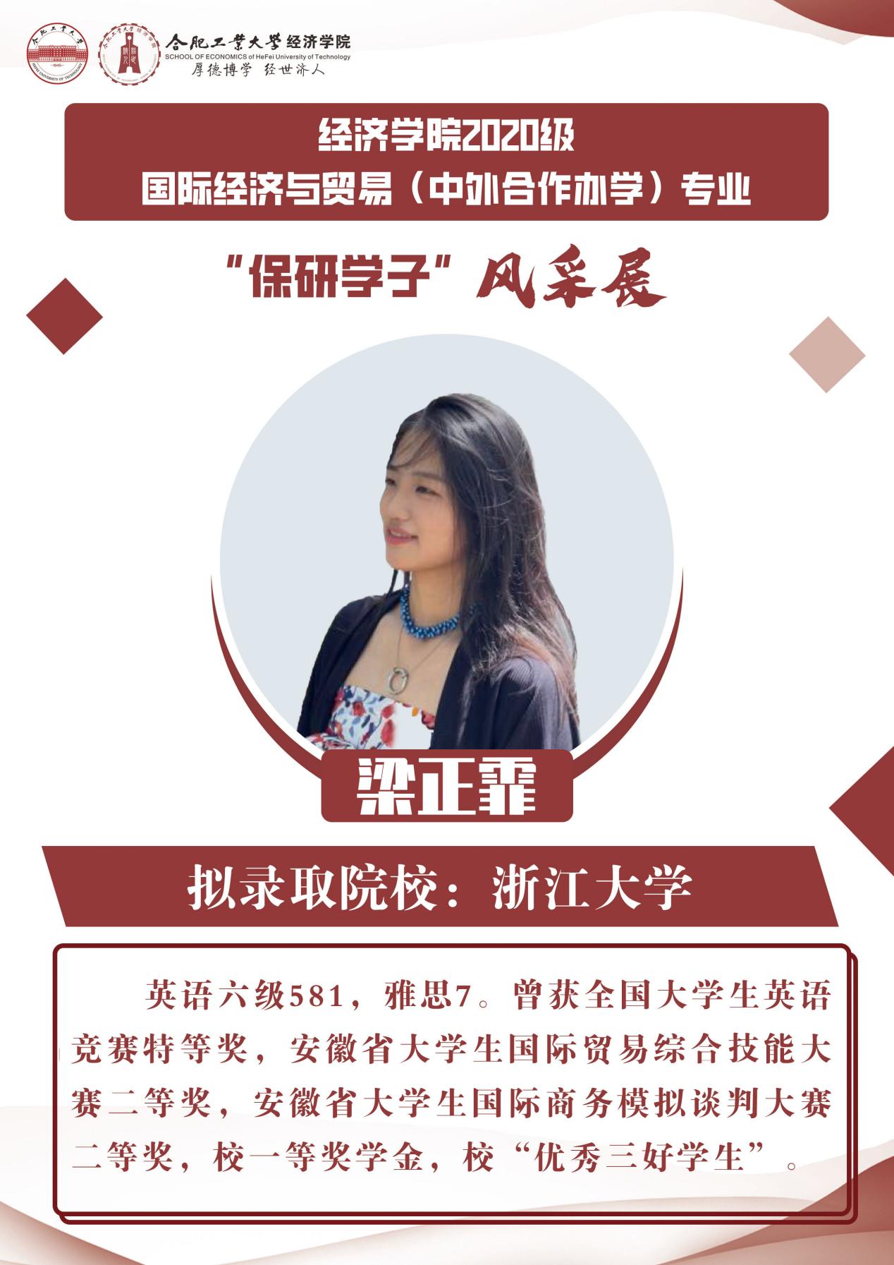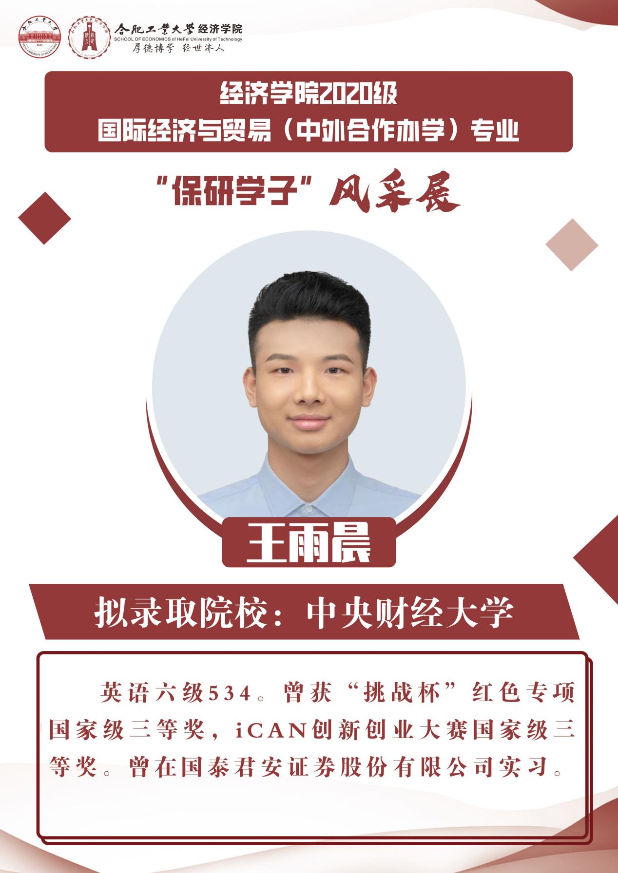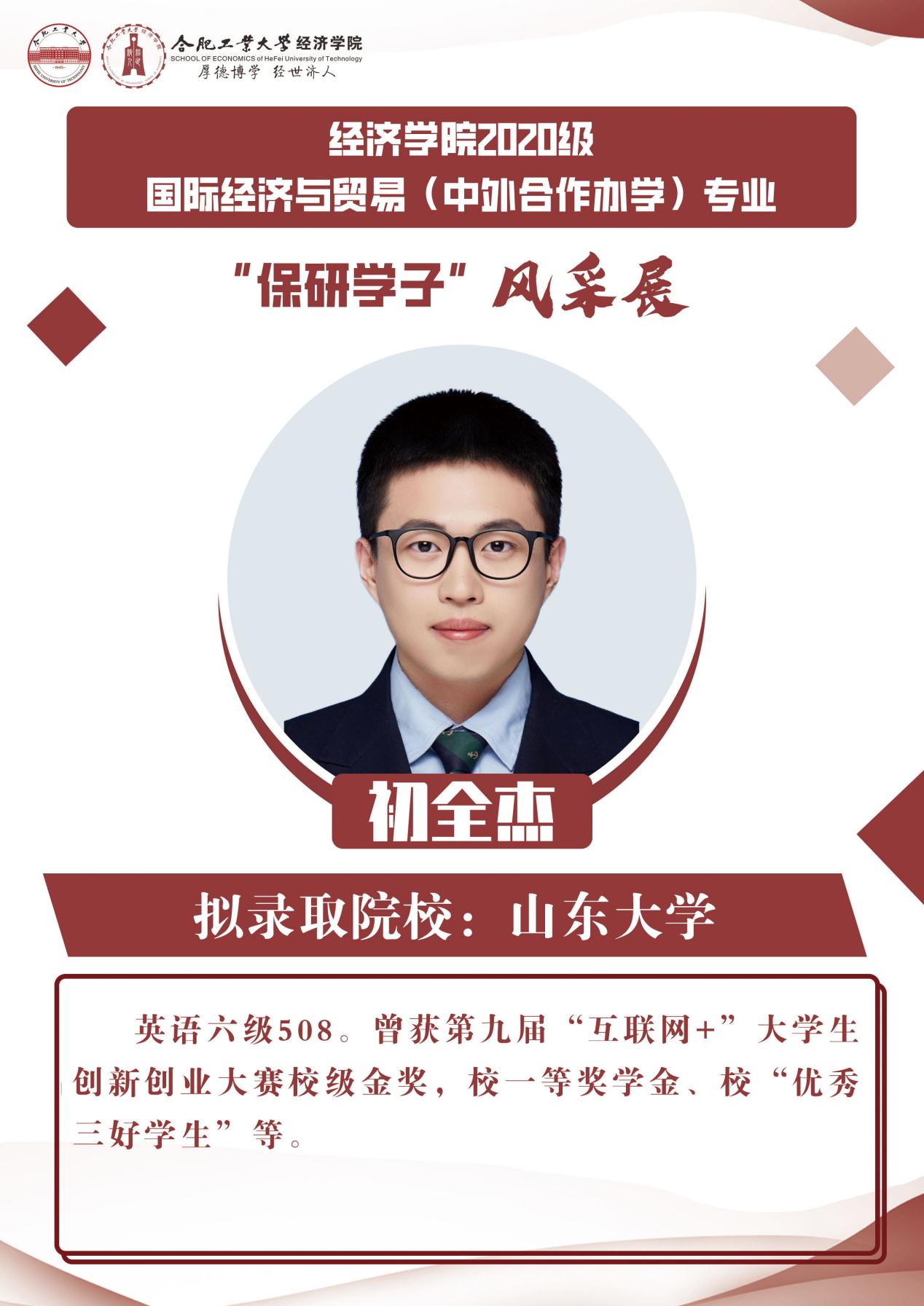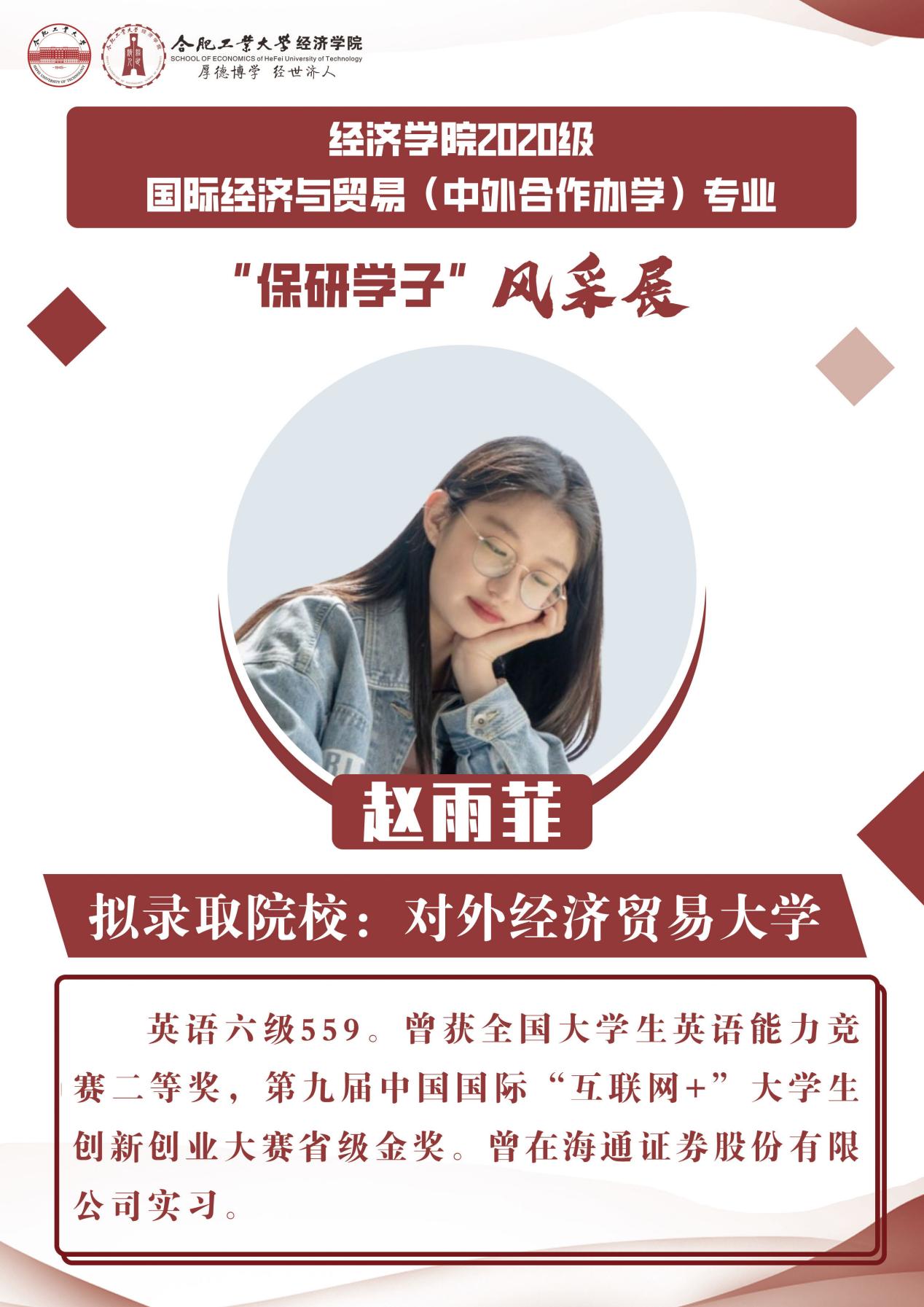 yL23411永利官网登录国际经济与贸易(中外合作办学)专业是国家级一流本科专业建设点。本专业注重将新科技与国际经济与贸易相融合,将贸易传统模式与数字贸易等新业态相结合,培养“强语言、精专业、通规则、能跨界”的高级复合型经贸人才。项目办学以来,人才培养成果呈现出“就业率高、就业单位质量高、升学率高、名校深造比率高、英语水平高”的“五高”显著特征。2020级国际经济与贸易(中外合作办学)专业学生中,15名推免生被中国人民大学、浙江大学、中央财经大学、对外经济贸易大学等国内名校拟录取。本期推文将带领大家共同领略2020级国际经济与贸易(中外合作办学)专业“保研学子”的风采。