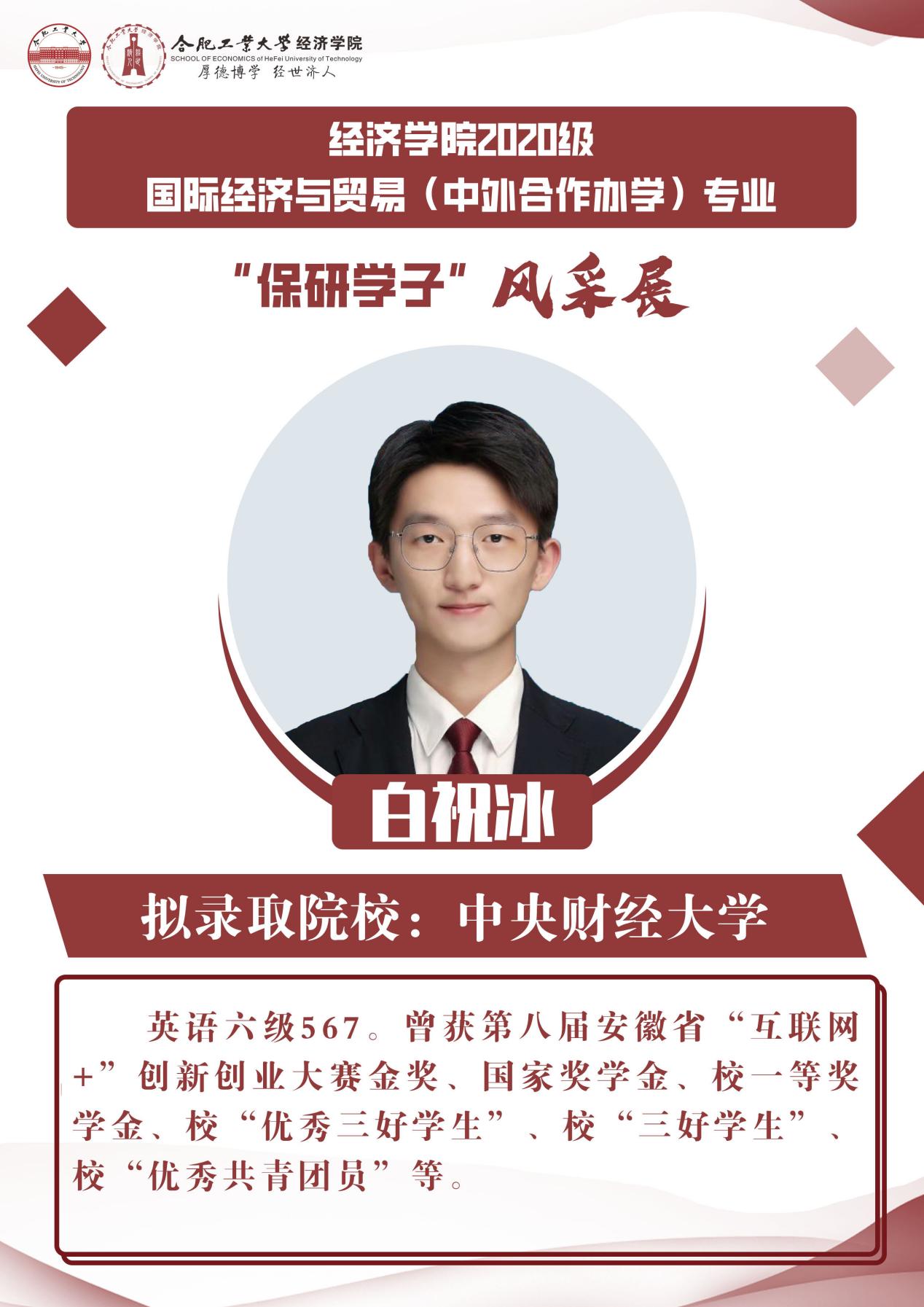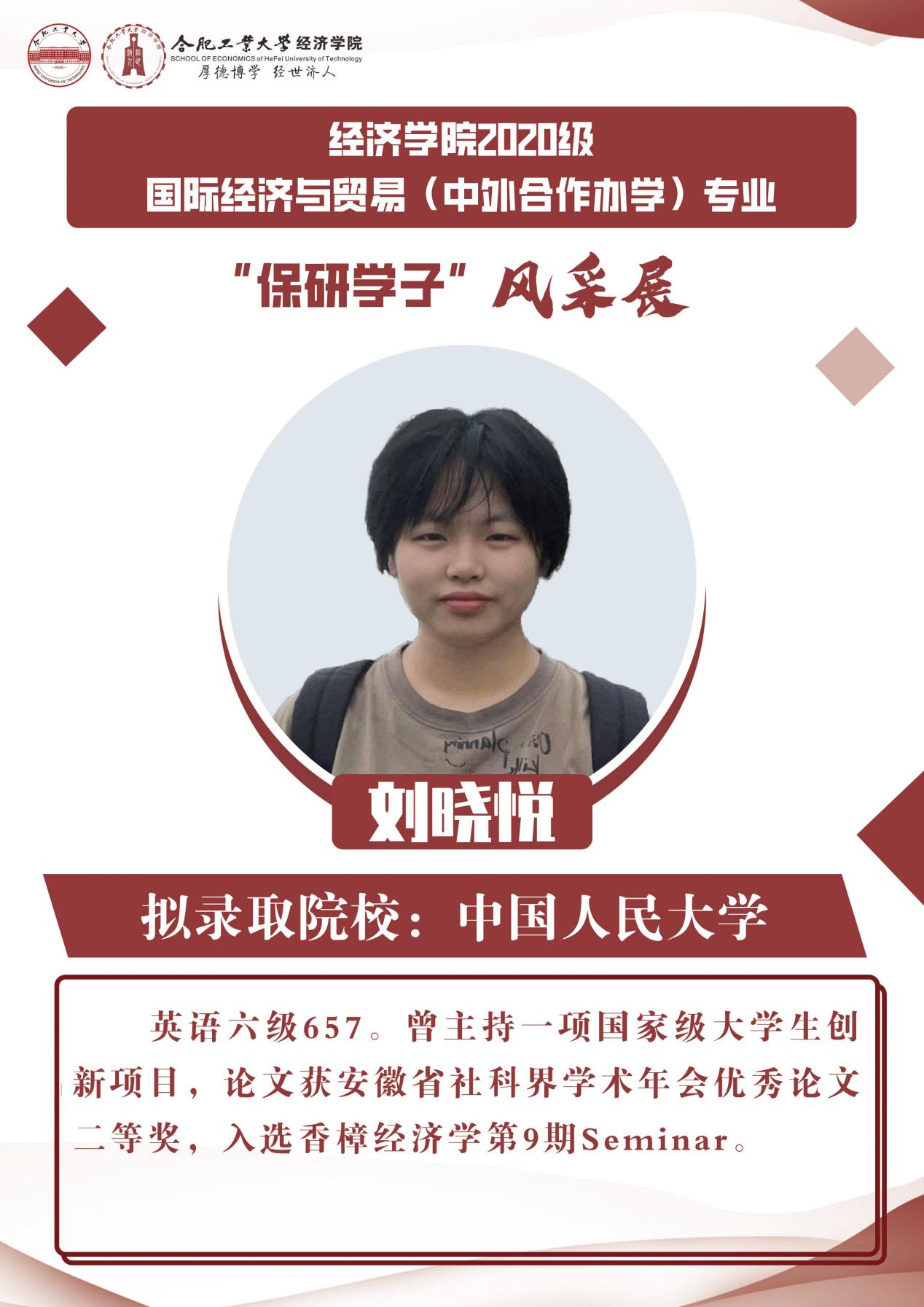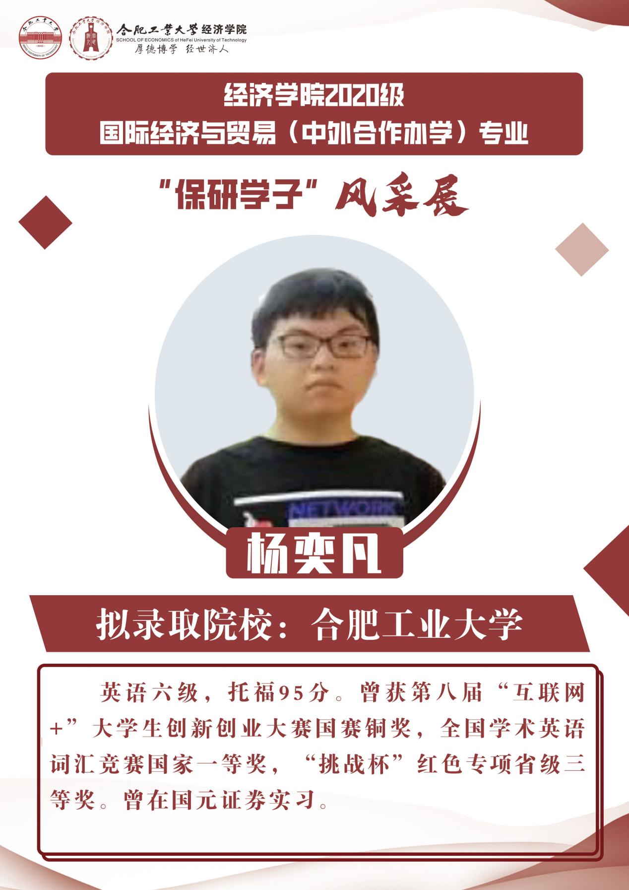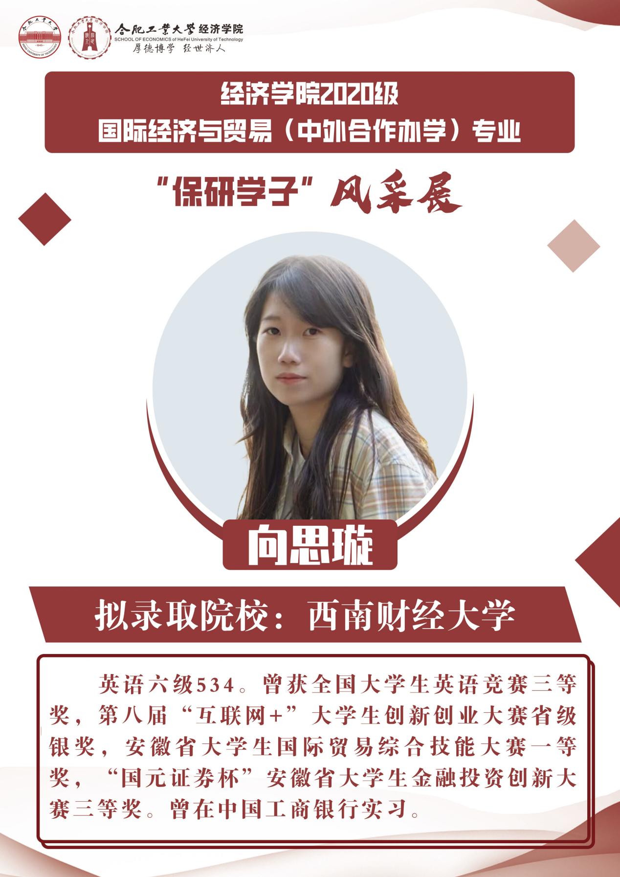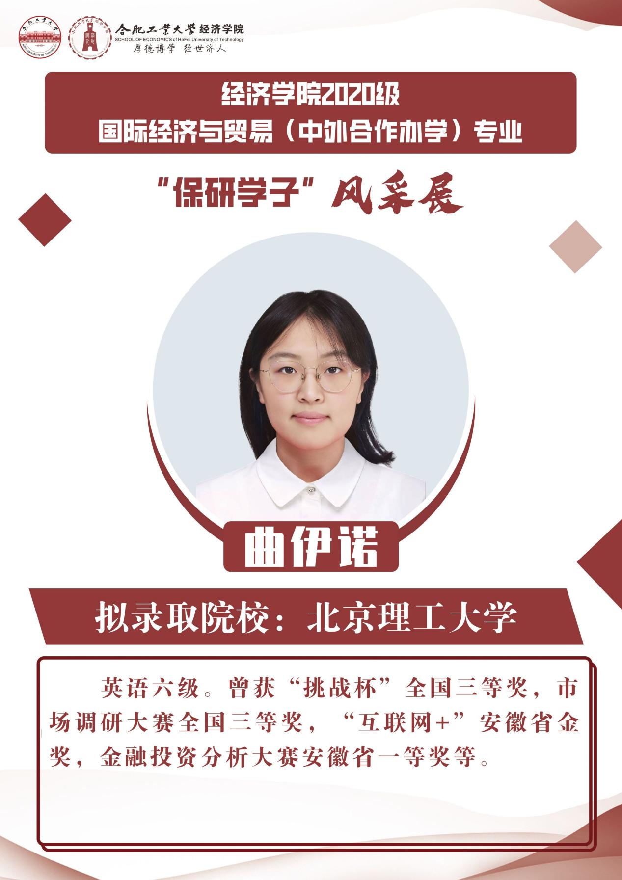 yL23411永利官网登录国际经济与贸易(中外合作办学)专业是国家级一流本科专业建设点。本专业注重将新科技与国际经济与贸易相融合,将贸易传统模式与数字贸易等新业态相结合,培养“强语言、精专业、通规则、能跨界”的高级复合型经贸人才。项目办学以来,人才培养成果呈现出“就业率高、就业单位质量高、升学率高、名校深造比率高、英语水平高”的“五高”显著特征。2020级国际经济与贸易(中外合作办学)专业学生中,15名推免生被中国人民大学、浙江大学、中央财经大学、对外经济贸易大学等国内名校拟录取。本期推文将带领大家共同领略2020级国际经济与贸易(中外合作办学)专业“保研学子”的风采。