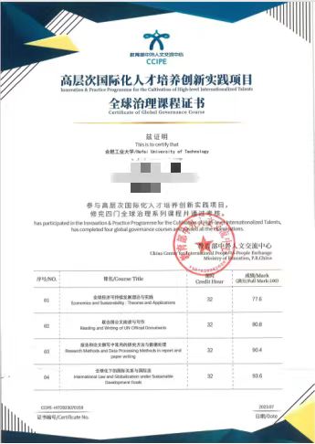 近日,20级国际经济与贸易(中外合作办学)专业同学参加教育部中外人文交流中心“高层次国际化人才培养创新实践项目”,有10名同学通过四门全球治理系列课程,顺利获得全球治理课程证书。