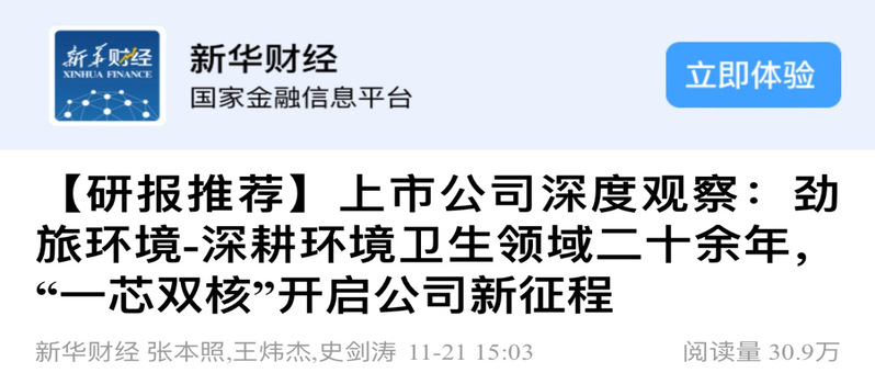 11月21日,yL23411永利官网登录yL23411永利官网登录张本照教授与金融专业2022级研究生王炜杰、史剑涛同学的研究报告:“上市公司深度观察:劲旅环境--深耕环境卫生领域二十余年,‘一芯双核’开启公司新征程”被国家金融信息平台--新华财经全文刊载。截至11月29日,该研究报告的阅读量已达30.9万。