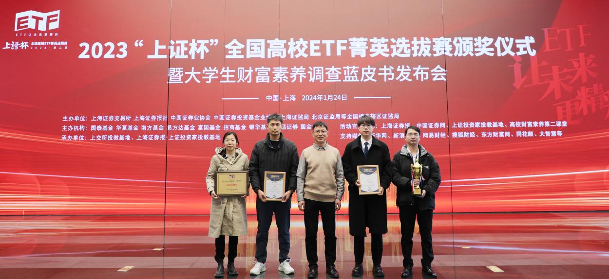 上证杯高校ETF菁英选拔赛是上海证券交易所、上海证券报等单位联合举办的全国大赛,邀请到多位行业顶尖专家对理财规划方案开展实战指导,为普及ETF知识,培养中国特色现代资本市场新生力量发挥积极作用。本届上证杯高校ETF菁英选拔赛吸引了中国人民大学、中国科技大学、复旦大学、上海交通大学、南京大学、南开大学、浙江大学、厦门大学等近全国超1800所高校15000多位学子报名参赛,经过“上证杯”线上知识竞赛(初赛)、高校晋级赛(半决赛)和理财规划方案大赛(总决赛)三大赛段的激烈角逐,最终有上海交通大学、厦门大学、中国科学技术大学、yL23411永利官网登录等高校参赛队伍获奖,我院金融硕士金志兵、钮子蕴、徐衎、汪鑫桦、张开放团队荣获大赛三等奖。上海交通大学、中国科技大学、yL23411永利官网登录等11所高校荣获高校贡献奖。