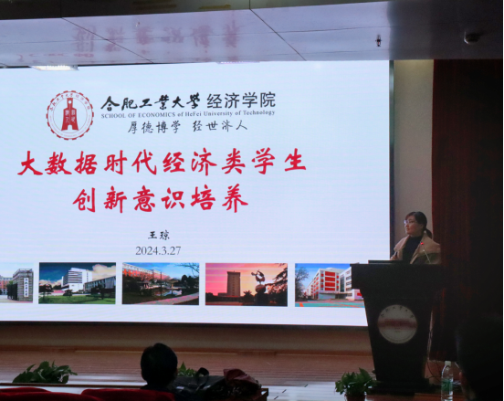 王琼老师阐述了创新创业能力的内涵,介绍了学校第一课堂、第二课堂等现有的创新创业平台和资源,分享了经院学生近年来在大创项目、学科竞赛、创业孵化等创新创业活动中取得的优秀成绩,鼓励同学们不断学习、积极实践、勇于尝试,不断提高自身创新意识和创业能力。
