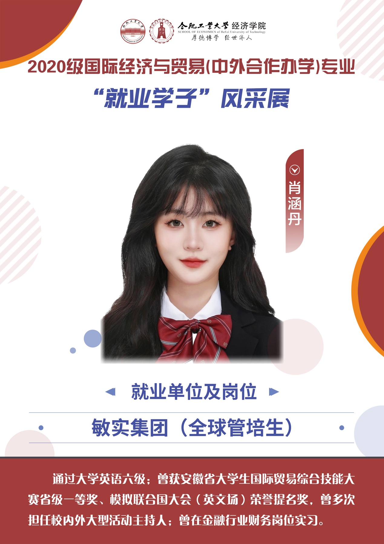 本期专访我们邀请了2020级国际经济与贸易(中外合作办学)专业的肖涵丹同学,让我们来一起听听她关于求职经历的心得体会吧!